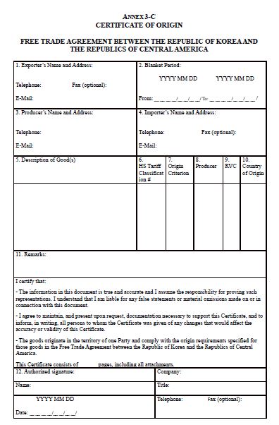 수출자 또는 생산자가 작성, 서명하고, 날짜를 기재하여야 한다. 날짜는 이 증명서가 작성되고 서명된 날짜이어야 한다. |